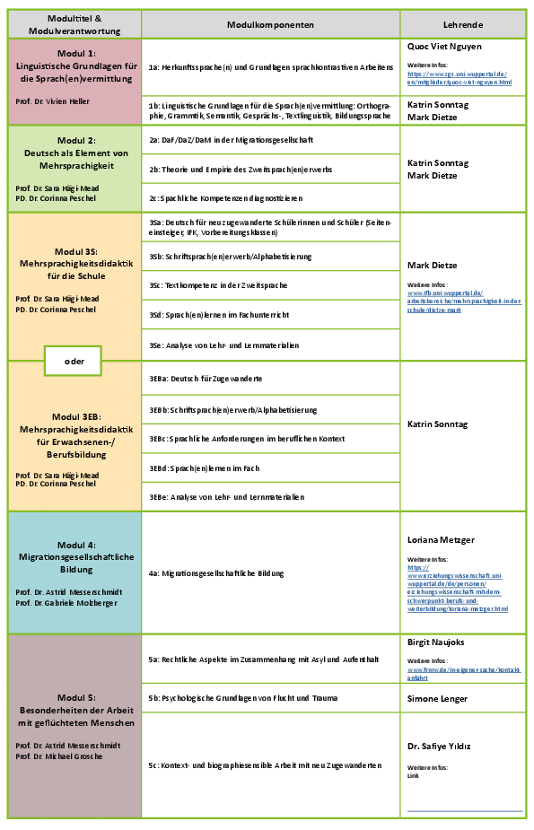 Sie finden hier einen Überblick über die Lehrenden und Modulverantwortlichen des DaZ-Zertifikatskurses. Bitte klicken Sie auf die Abbildung für eine größere Ansicht.