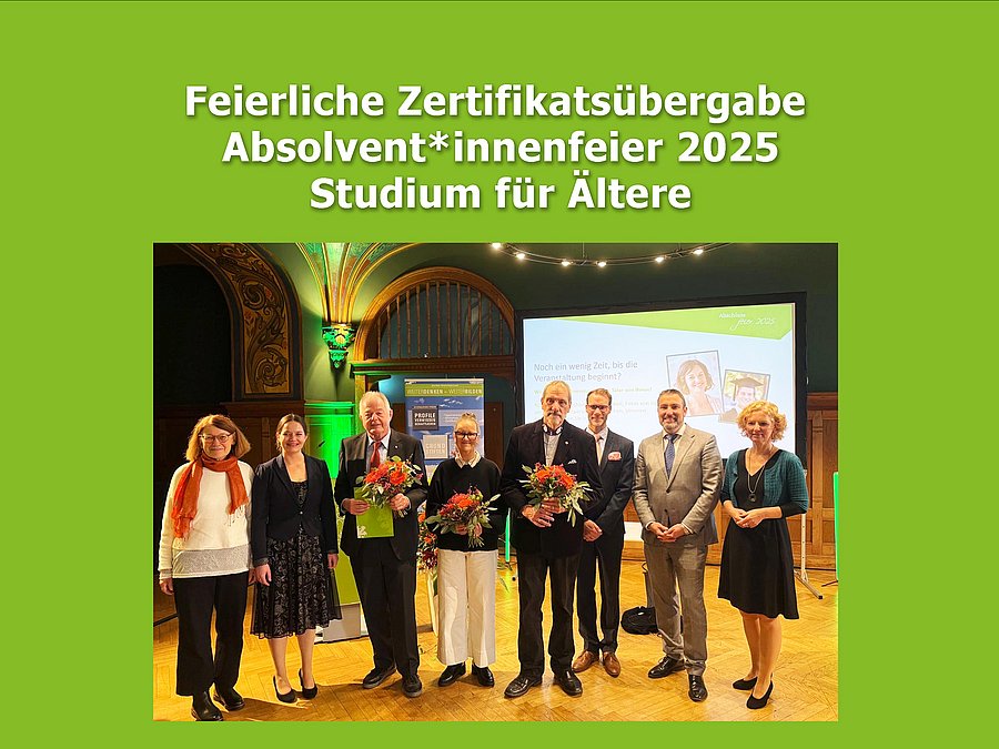 Das Studium für Ältere eröffnet die Möglichkeit, im Alter neue Wege des Lernens zu gehen, Interessen zu vertiefen und unbekannte Fähigkeiten zu entdecken. Die Absolvent*innenfeier bietet den feierlichen Rahmen, Erreichtes gebührend zu würdigen und die Studienerfolge angemessen zu feiern.