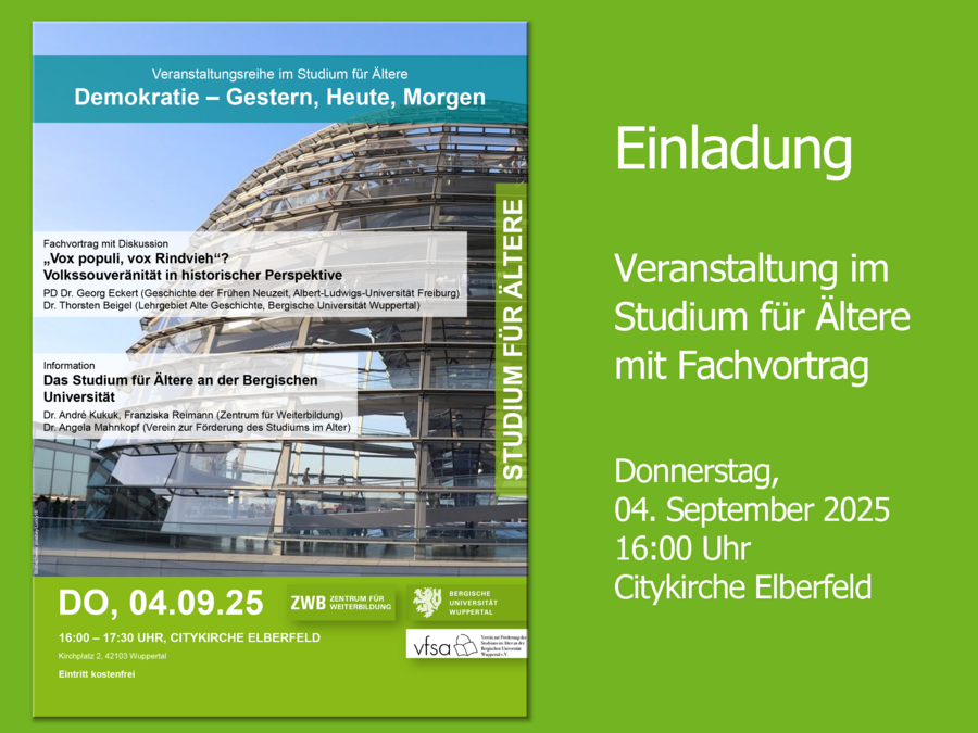 Wir freuen uns sehr, dass PD Dr. Georg Eckert von der Albert-Ludwigs-Universität Freiburg und Dr. Thorsten Beigel aus dem Lehrgebiet Alte Geschichte der Bergischen Universität einen Vortrag zum Thema „Vox populi, vox Rindvieh"? Volkssouveränität in historischer Perspektive halten werden. Nach dem Fachvortrag laden wir Sie herzlich ein, an vertiefenden Diskussionen teilzunehmen. Im Anschluss stehen Ihnen das Team des ZWB und der vfsa gerne zur Verfügung, um das Studium für Ältere an der Bergischen Uni näher zu erläutern und Ihre Fragen zu beantworten.