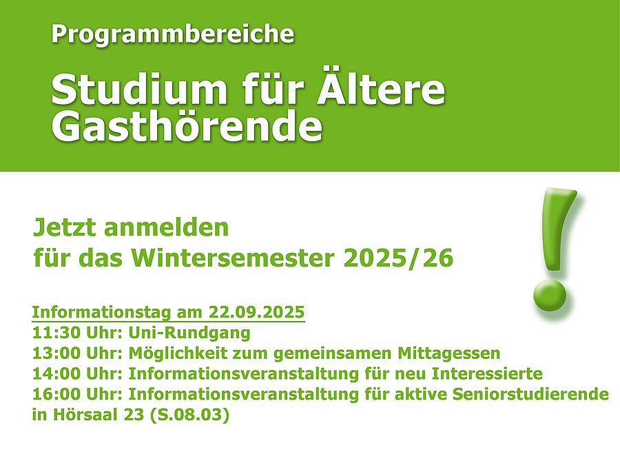 Das Zentrum für Weiterbildung (ZWB) lädt alle Interessierten und Neu-Einsteiger*innen am Montag, 22. September 2025, ab 11:30 Uhr zu einem Informationstag rund um das Studium für Ältere und die Gasthörendenschaft ein.