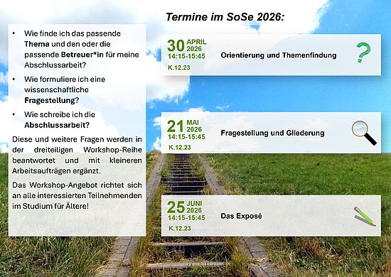 Das Vorlesungsverzeichnis für das Sommersemester 2025 wird am 17. Februar freigegeben. Sie finden Ihre Studienveranstaltungen in StudiLöwe unter 'Vorlesungsverzeichnis anzeigen' - 'Sonstige Angebote - Weiterbildung - Zentrum für Weiterbildung - Studium für Ältere'.