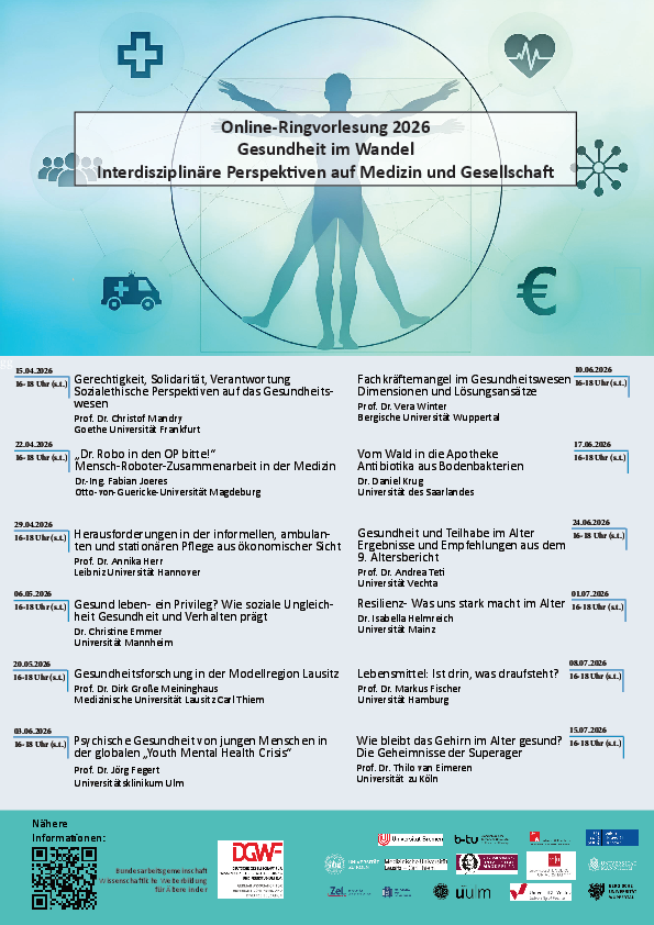Im Rahmen der bundesweiten Online-Ringvorlesung der Bundesarbeitsgemeinschaft Wissenschaftliche Weiterbildung für Ältere (BAGWIWA) in der Deutschen Gesellschaft für wissenschaftliche Weiterbildung und Fernstudium - DGWF e. V. – wird auch im Sommersemester 2026 eine Ringvorlesung angeboten, diesmal zum Thema „Gesundheit im Wandel: Interdisziplinäre Perspektiven auf Medizin und Gesellschaft“.